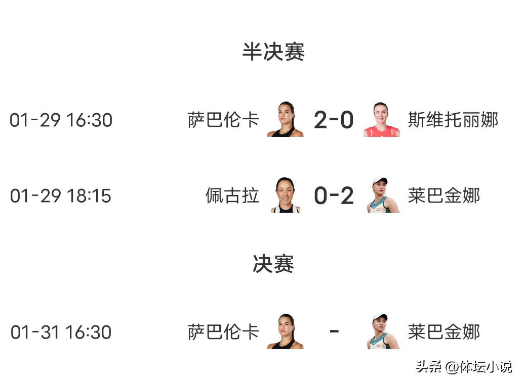 On January 30th Beijing time, the women's singles semifinals at the Australian Open wrapped up, where Sabalenka dominated Svitolina 2-0 and Rybakina beat Pegula 2-0. Thus, the final matchup for this tournament is confirmed: a battle between the two "Ba"s, Sabalenka and Rybakina. The final will take place on the 31st at 4:30 PM!