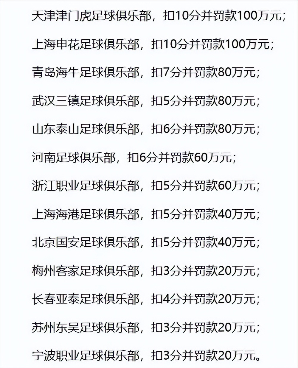 The 13 punished clubs include 9 from the Chinese Super League and 4 from China League One. The Super League clubs faced point deductions of 10, 7, 6, and 5 points, with fines of 1 million, 800,000, 600,000, and 400,000 yuan respectively; League One clubs had point deductions of 4 or 3 points, with fines of 200,000 yuan.