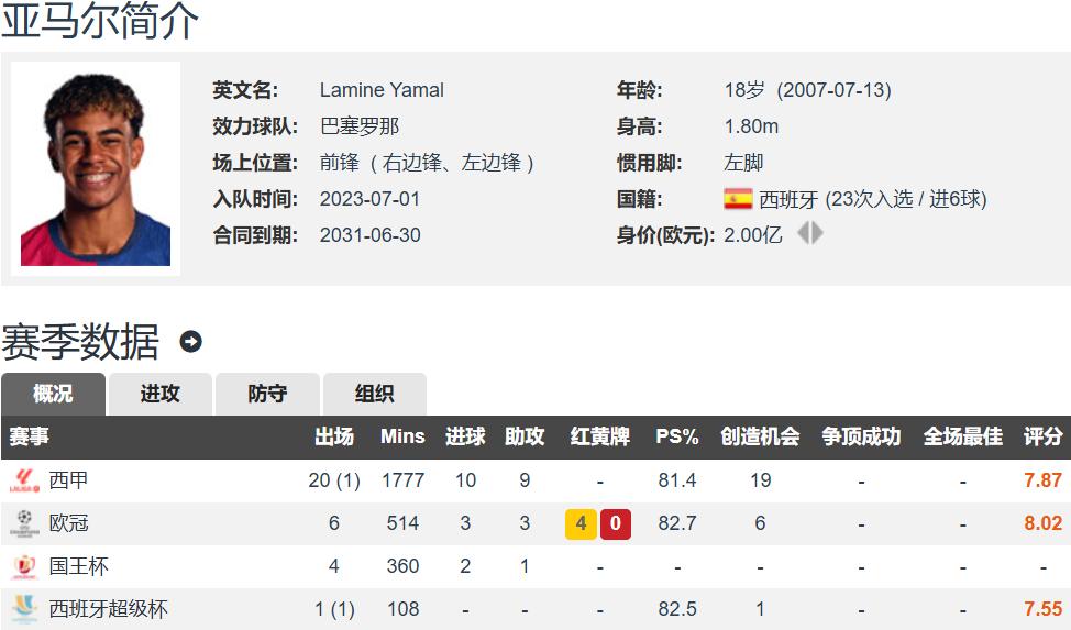 Yamal is 18 years old, stands 1.80 meters tall, is left-footed, and primarily plays as a right winger. His contract with Barcelona runs until 2031, and his market value on Transfermarkt is estimated at €200 million, making him one of the most valuable players in world football. So far this season, Yamal has made 33 appearances for Barcelona across all competitions, starting 31 of them, and has contributed 15 goals and 13 assists, achieving a double-double early in the campaign.