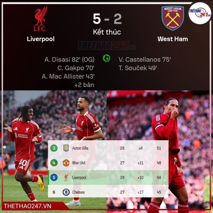 Despite Liverpool's expected goals (xG) in the match being only 0.7, they still went into halftime with a significant lead. Although they conceded goals to Tomas Soucek and Taty Castellanos for West Ham, goals from Cody Gakpo and an own goal by Axel Disasi helped Liverpool secure their fourth win in their last five Premier League matches, thereby climbing to fifth place in the league table.