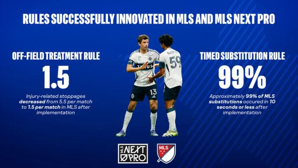 These two rules were trialed in Major League Soccer in 2024 and entered the Leagues Cup involving Mexican clubs in 2025. The new rules had an immediate effect on reducing time-wasting. In MLS, stoppages due to player injuries decreased by 72%, from an average of 5-6 per game to 1.5. During the 2025 MLS season, across 510 matches with 4346 substitutions, only 12 violations of the "10-second substitution" rule occurred, effectively speeding up the game's rhythm.