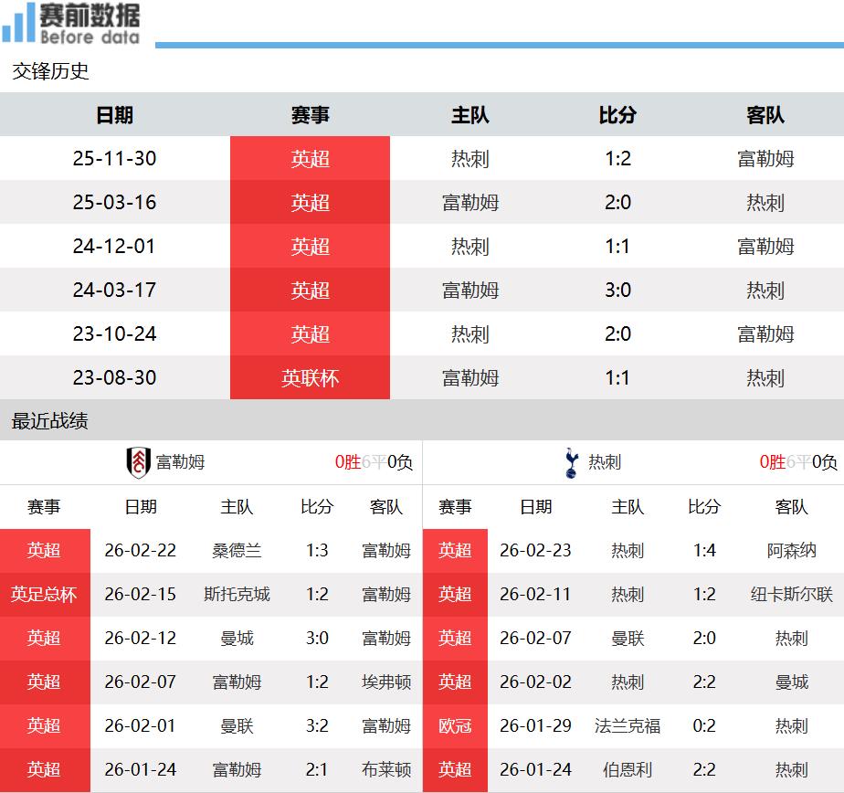 First:The situation of both teams! After 27 Premier League rounds, Fulham have 11 wins, 4 draws, and 12 losses, with 37 points placing them 10th. Tottenham have 2 wins, 8 draws, and 12 losses, with 29 points placing them 16th. In the last round, Fulham defeated Sunderland 3-1 away, ending a three-game losing streak in the league; Tottenham lost 1-4 at home to Arsenal, suffering a third consecutive league defeat and extending their winless run to nine matches.