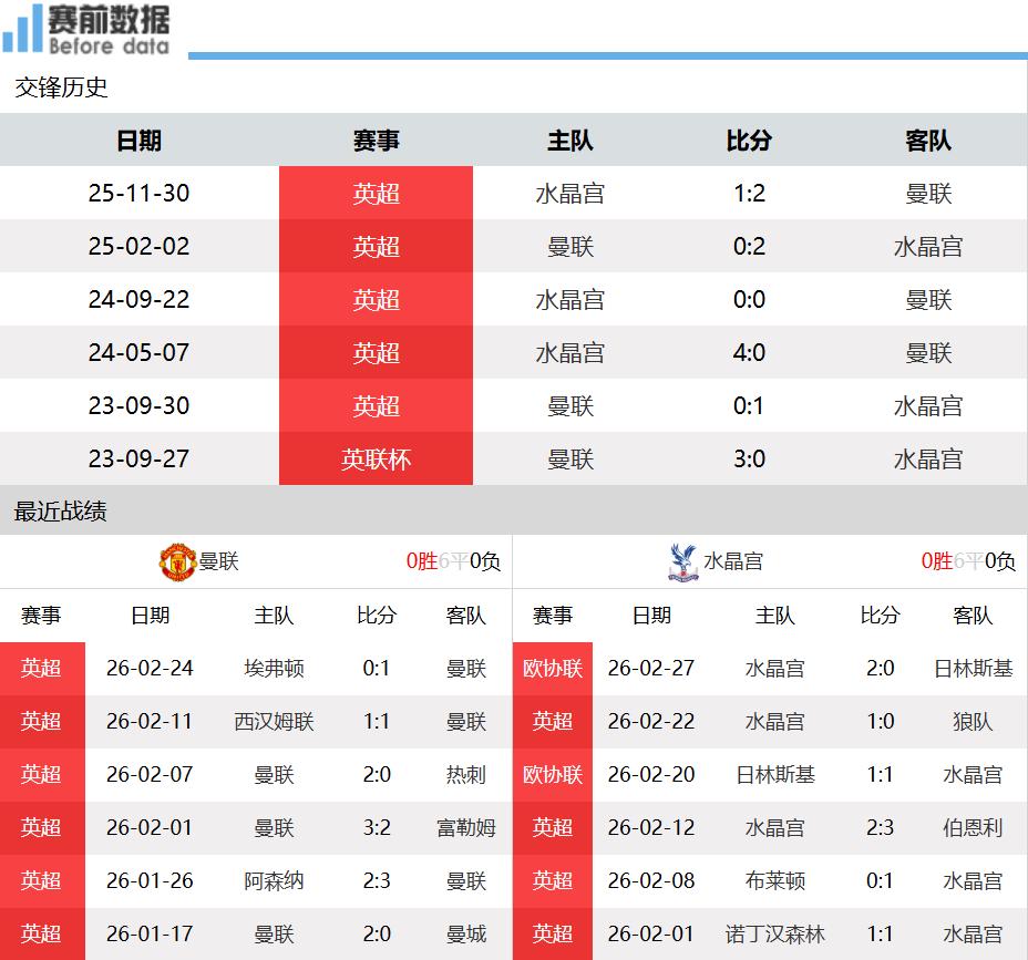 First:Situation of Both Teams! After 27 rounds of the Premier League, Manchester United has 13 wins, 9 draws, and 5 losses, accumulating 48 points and ranking fourth, trailing third-placed Aston Villa (who have played an extra game) by 3 points. Crystal Palace has 9 wins, 8 draws, and 10 losses, accumulating 35 points and ranking thirteenth, a position with little pressure. In the last Premier League round, Manchester United narrowly won 1-0 away against Everton, remaining unbeaten in their last 10 matches with 6 wins and 4 draws. The team has been revitalized under Carrick's management, showing improved performance. Crystal Palace secured a narrow 1-0 home win against bottom-placed Wolves and advanced by defeating their opponent 2-0 at home in the UEFA Europa Conference League midweek.