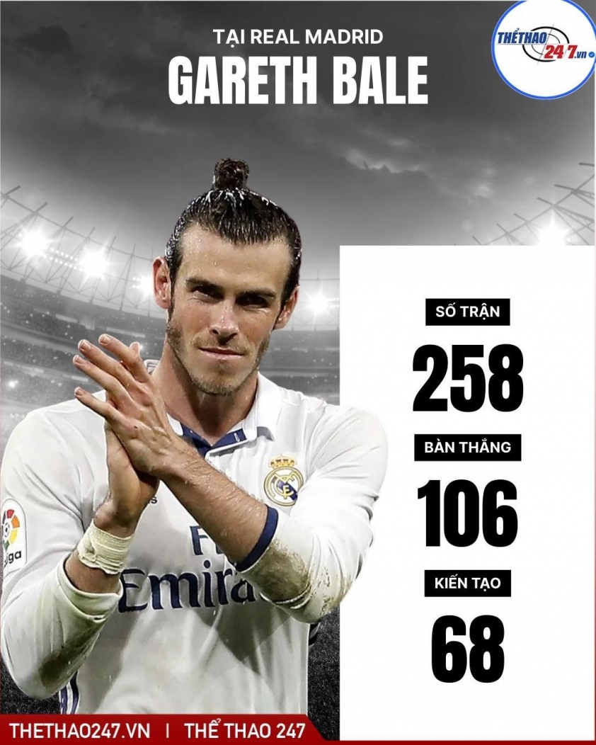 Wearing the Los Blancos shirt, Bale made 258 appearances, scoring 106 goals and providing 68 assists. With Real Madrid, he won every major trophy, most notably 5 Champions League