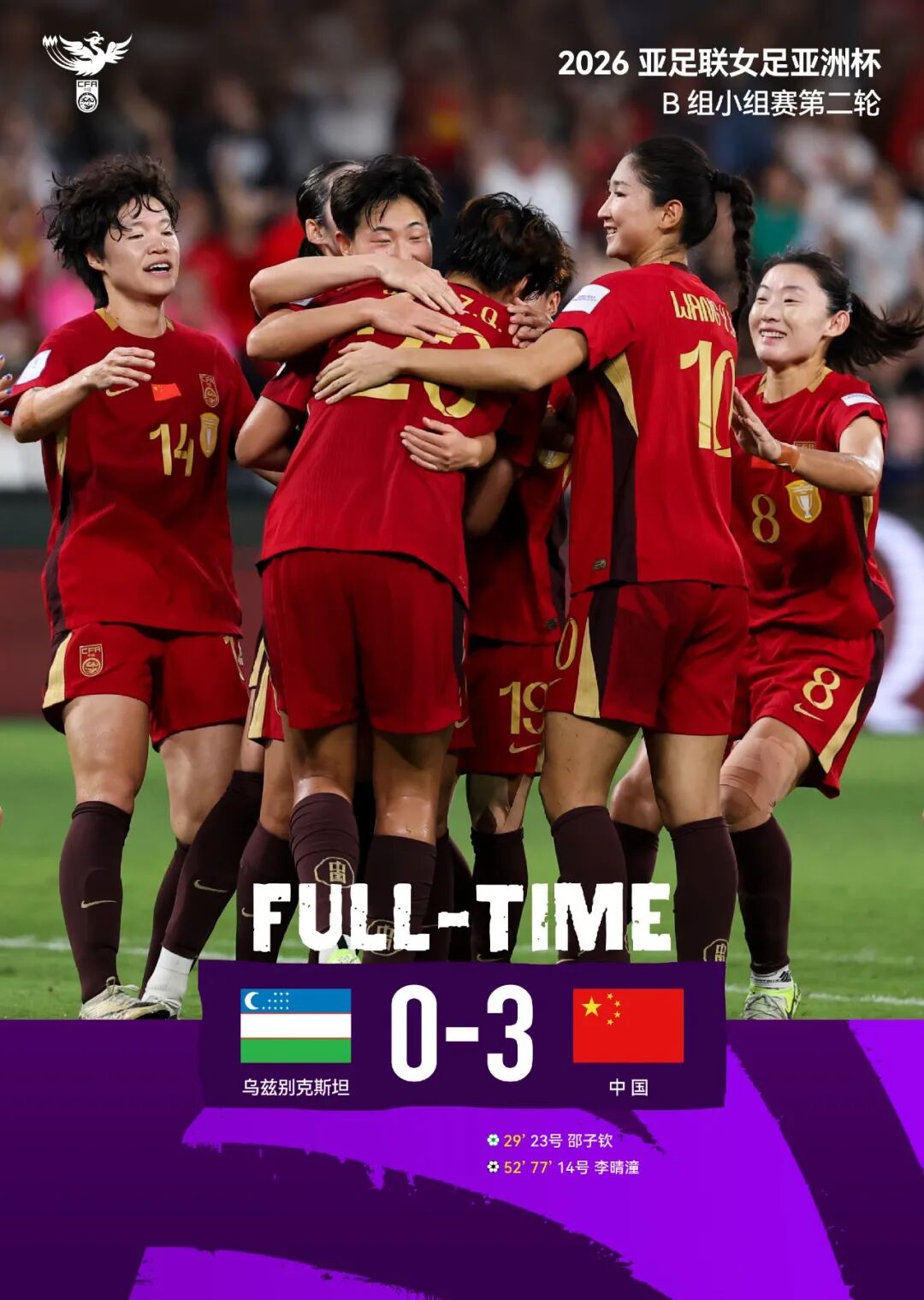 Two consecutive wins secure advancement! Women's Asian Cup: China 3-0 Uzbekistan, Li Qingtong scores twice, Shao Ziqin nets one! Next match against North Korea!