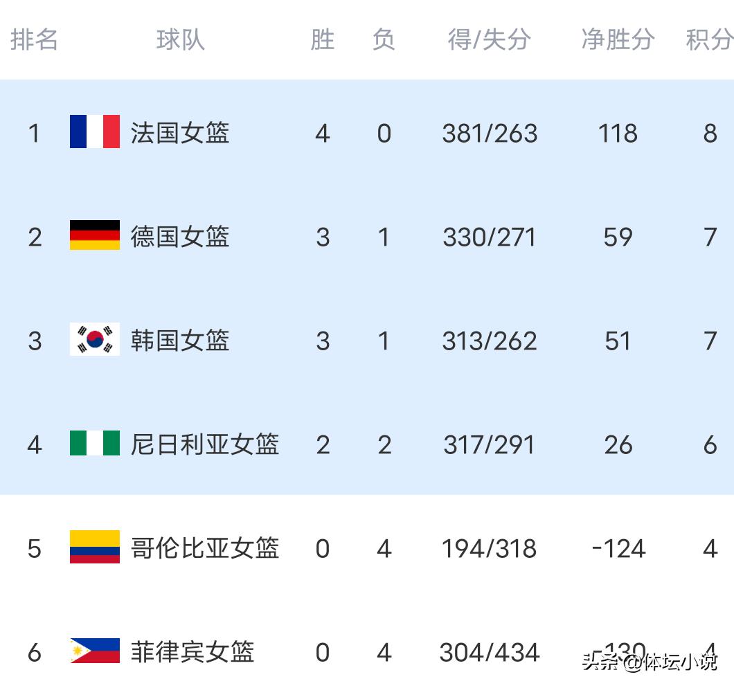 The Korean women's basketball team was fortunate in its group draw. Host Germany and African Cup champion Nigeria had already qualified for the World Cup early, so this group essentially had four teams competing for two spots. Currently, the French women's basketball team is unstoppable, with four consecutive wins securing the top spot and locking in a qualification berth. The Korean team only lost to Germany. By outperforming Colombia and the Philippines, they secured their World Cup qualification. In the fourth round, facing the struggling Philippines team that had suffered three consecutive losses, Korea displayed overwhelming dominance, unleashing an offensive onslaught against the Philippines and creating a 31-point super rout, thus advancing to the World Cup early!
