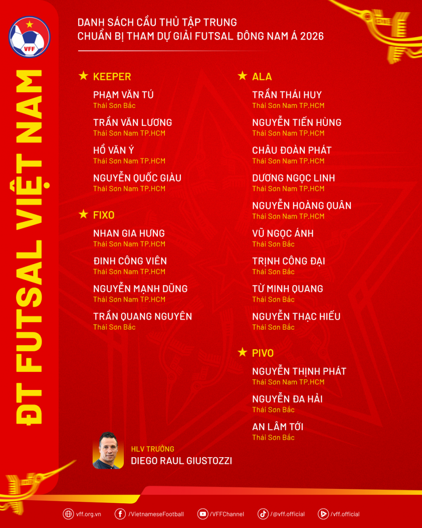 Notably in the roster is the return of goalkeeper Ho Van Y. The veteran goalkeeper of Vietnam futsal has been absent from the national team recently due to incomplete recovery from injury. Recalling Ho Van Y demonstrates head coach Diego Giustozzi's expectations regarding this goalkeeper's experience and caliber. If he meets the technical requirements and ensures physical fitness, Ho Van Y will be a crucial addition to the Vietnam national futsal team's goal frame in the regional arena.