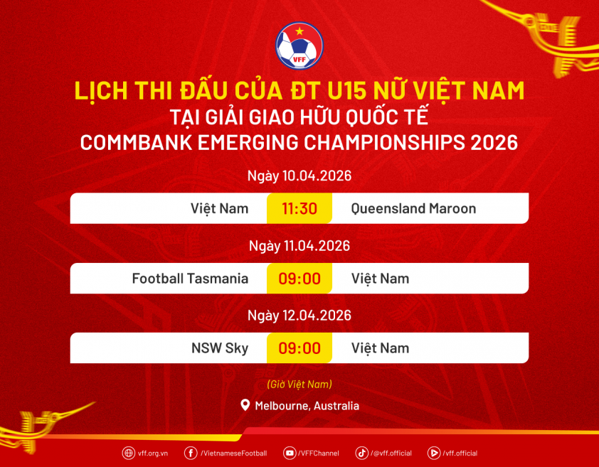 In Australia, Vietnam's U15 women's team will participate in the CommBank Emerging Championships 2026, held from April 9 to April 15 at the Home of the Matildas Centre (Bundoora, Melbourne). This is a reputable youth talent development platform in Australian football, gathering top youth teams and international guest teams.