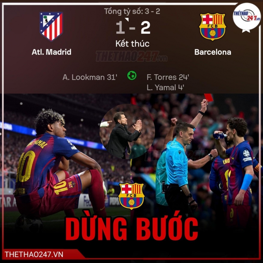 Barcelona started explosively, quickly taking a 2-0 lead, including a goal from Lamine Yamal. However, Ademola Lookman's goal to reduce the deficit helped Atletico regain the advantage. The turning point came when Eric Garcia received a red card, causing Barcelona to lose control in the final minutes and unable to reverse the situation.