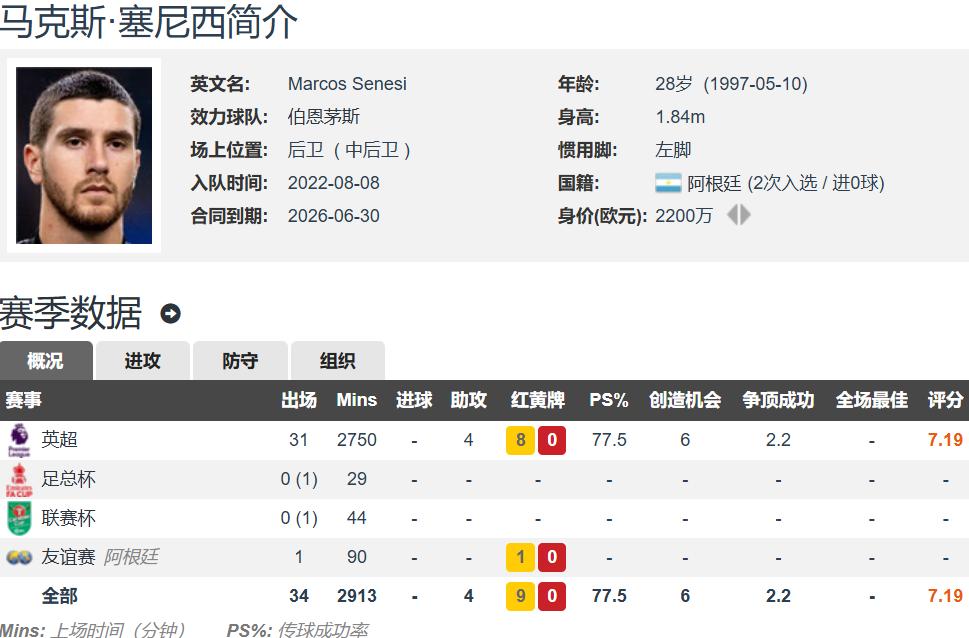 Senesi is 28 years old, stands 1.84 meters tall, plays as a left-footed center-back, and has a Transfermarkt valuation of €22 million. This season, he has appeared in 31 Premier League matches, all as a starter, and has contributed 4 assists from his defensive position.
