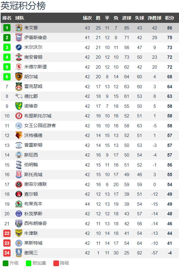 Looking at the Championship standings, it feels quite familiar—many familiar names that have played in the Premier League. Lampard's Coventry, after 43 rounds, has 25 wins, 11 draws, and 7 losses, accumulating 86 points. They lead the third-place team by 13 points and have secured promotion to the Premier League three rounds early.