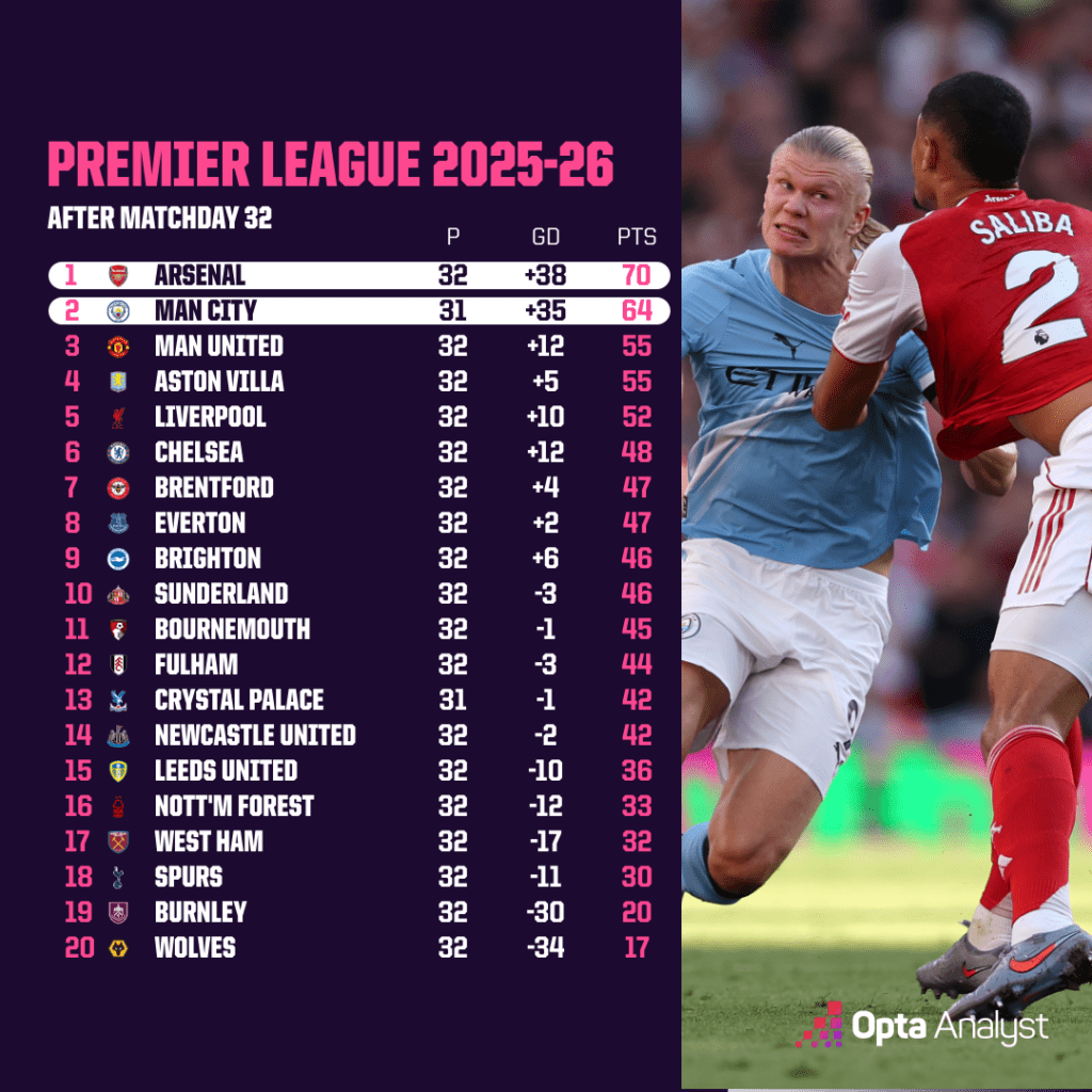 The title race Premier League season 2025/26 is entering its most dramatic phase. Arsenal currently leads the table with a 6-point advantage, but Manchester City's strong resurgence is breathing down the necks of manager Mikel Arteta and his team. This match in round 33 is considered the "breaking point" of the season, where Pep Guardiola's late-season prowess confronts the Gunners' desire to break their curse.