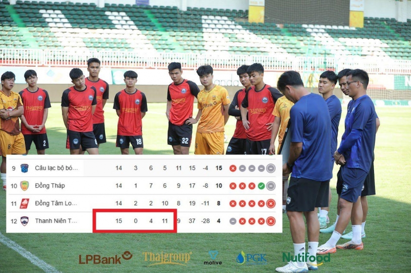 With merely 4 points after 15 rounds, Thanh Niên TP.HCM is currently the only team without any victory in Vietnam's professional football leagues for the 2025-2026 season, with a record of 11 losses and 4 draws. They are trailing the second-to-last team Long An by 4 points, and the prospect of relegation becomes increasingly clear as the season only has 7 rounds remaining.