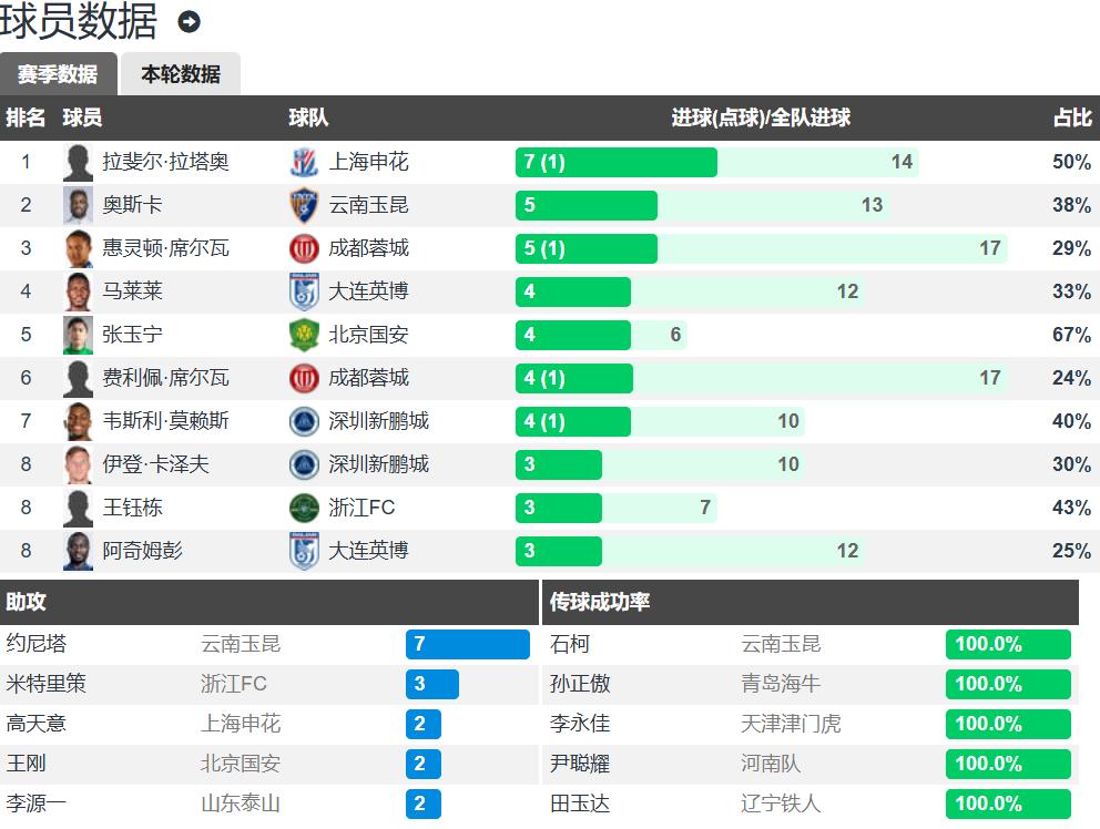 On the CSL scoring chart, Shanghai Shenhua foreign player Latang leads with 7 goals, Oscar and Wellington Silva tied second with 5 goals each; on the assists chart, Yunnan Yukun foreign player Ionica leads far ahead with 7 assists.