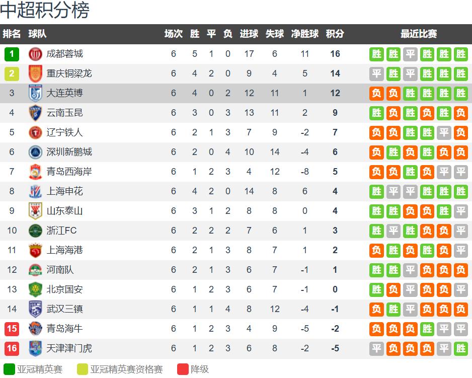 - Chengdu Rongcheng: 16 points, 5 wins and 1 draw, unbeaten, a contender for the championship.