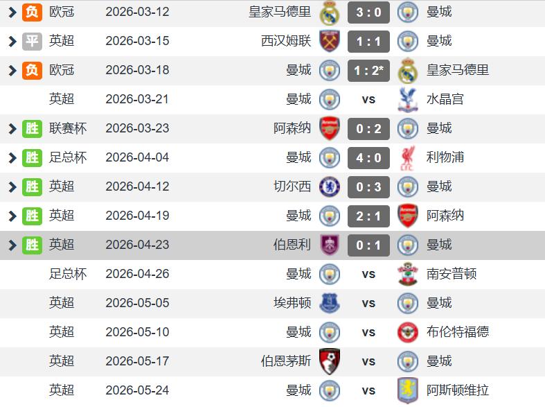 From mid-March to mid-April, Manchester City faced a brutal fixture list, competing in four competitions over seven matches, including two clashes with Real Madrid and Arsenal, plus games against Liverpool and Chelsea. In these seven matches, aside from being eliminated by Real Madrid in the Champions League round of 16, City won four and drew one of the remaining five, defeating Arsenal twice and beating Liverpool and Chelsea.