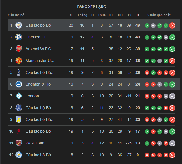 Currently, Manchester City shares the same points with Arsenal but ranks higher due to superior statistics, temporarily occupying the top spot. However, pressure could quickly return if Arsenal gains points in their match against Newcastle in this round.