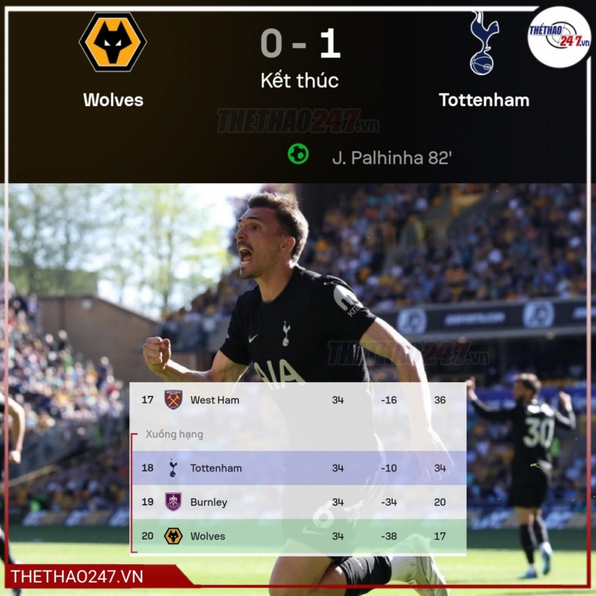 (Football result) - Tottenham clinched a tense 1-0 victory over Wolves in Premier League round 34, yet they are still positioned 18th following West Ham's win, making the relegation battle even more intense.