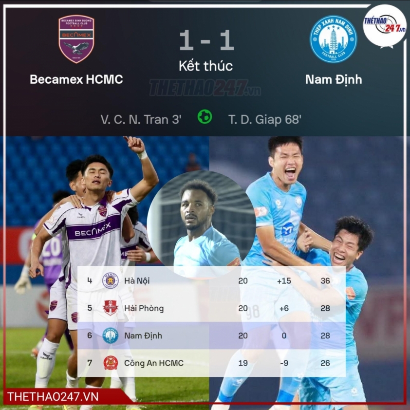 The 1-1 draw between Thép xanh Nam Định and Becamex TP.HCM at Bình Dương stadium on April 25th evoked mixed emotions. The home team started dreamily with Việt Cường scoring in the 2nd minute after Minh Khoa's assist. The early goal boosted Becamex TP.HCM's confidence, allowing them to maintain a tight grip on the game for most of the first half and causing significant difficulties for the visiting side.
