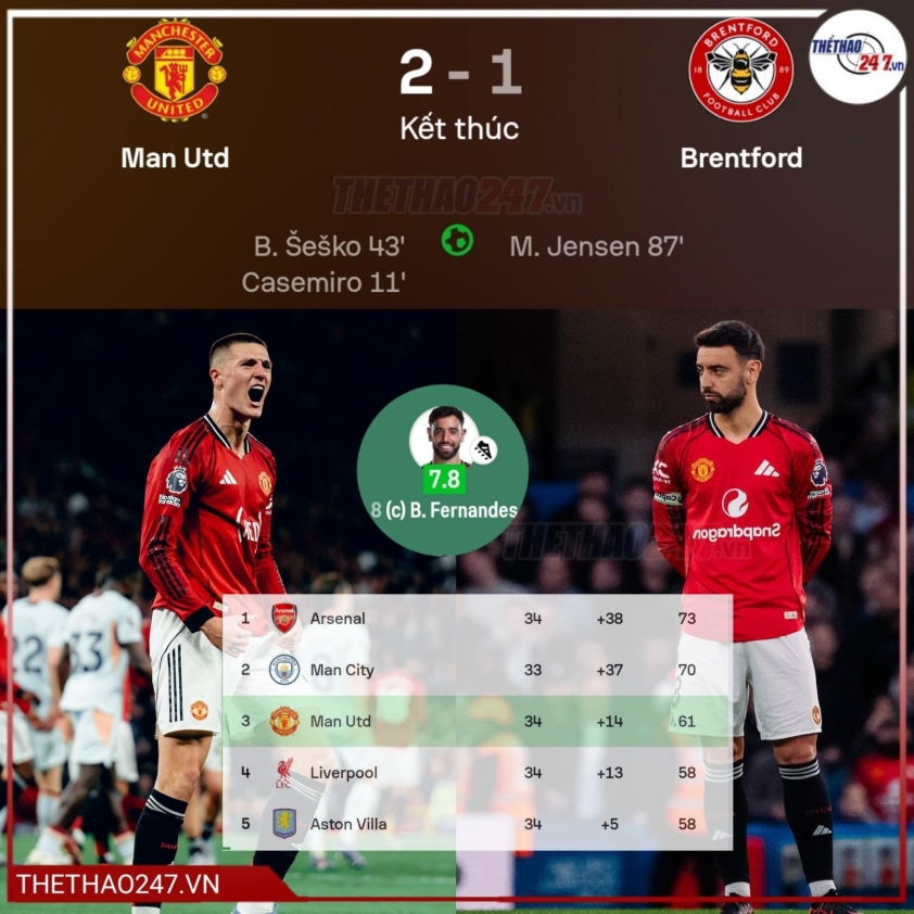 (Football result) - Manchester United clinched a thrilling 2-1 victory over Brentford at Old Trafford, edging nearer to Champions League qualification. Casemiro and Šeško were standout performers, as the away side wasted unfortunate chances.