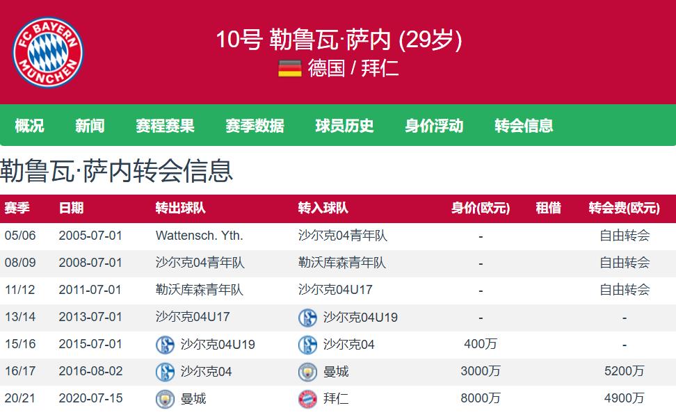 Sane grew up and made a name for himself at Schalke 04, the player joined Manchester City in the summer window of 2016 for a transfer fee of 52 million euros, and 39 goals and 44 assists in 135 games in a four-year blue moon career; The player joined Bayern Munich in the summer window of 2020 for a transfer fee of 49 million euros, and has 61 goals and 55 assists in 220 games in his five-year Bayern career.