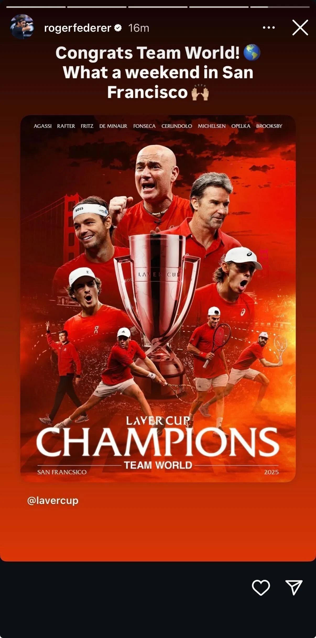 After the event, Federer shared a photo of Team World’s celebration featuring captain Agassi, Fritz, Deminal, Cerundolo, Michelson, Fonseca, and Opelka. The Swiss added a heartfelt message: “Congratulations to Team World! Had a fantastic weekend in San Francisco.”