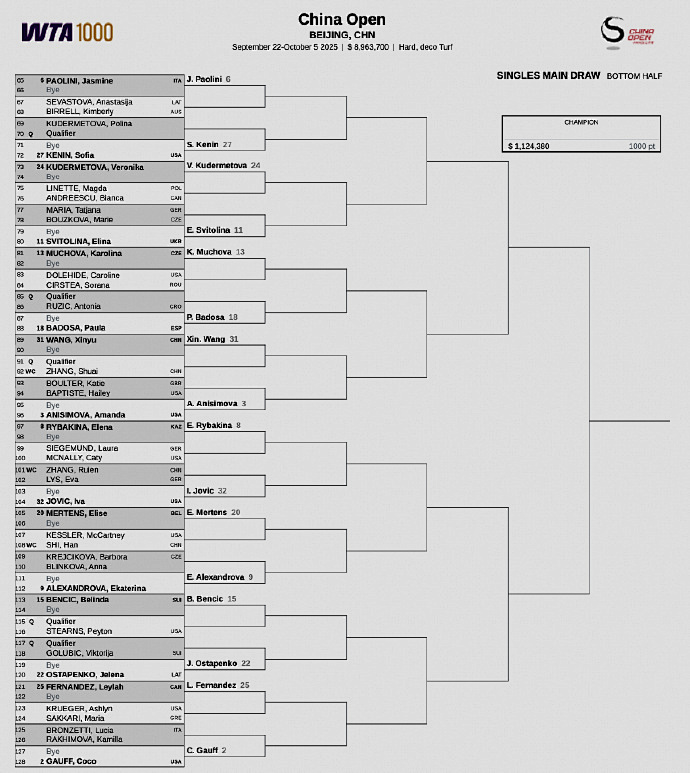 China’s top player Zheng Qinwen is seeded seventh with a first-round bye; potential opponents on her path include Ramenes, Noskova, Tauson, Mboko, overall a favorable draw. Second-ranked Wang Xinyu also has a first-round bye. Other Chinese players’ first-round matches are: Yuan Yue vs Putintseva, Zhu Lin vs qualifier, Wei Sijia vs Semenz, Guo Hanyu vs Wang Xiyu, Zhang Ruien vs Lis, Shi Han vs Kessler.