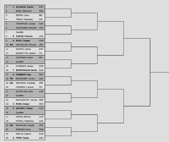Also, the ATP500 Tokyo event released the men’s singles main draw. World No.1 Alcaraz, American Fritz, and the “Nordic duo” Ruud and Rune are the top four seeds. The top eight seeds’ matchups: top half Alcaraz vs Tiafoe, Ruud vs Shapovalov; bottom half Humbert vs Rune, Mahach vs Fritz.