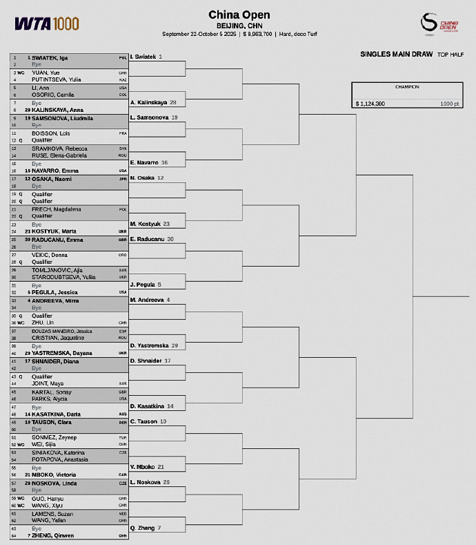 Turning to the China Open, last night Beijing time, the WTA1000 China Open released the women’s singles main draw. The top eight seeds’ matchups: top half includes Swiatek vs Pegula, Zheng Qinwen vs Mira Andreeva; bottom half has Anisimova vs Barty, Rybakina vs Gauff.