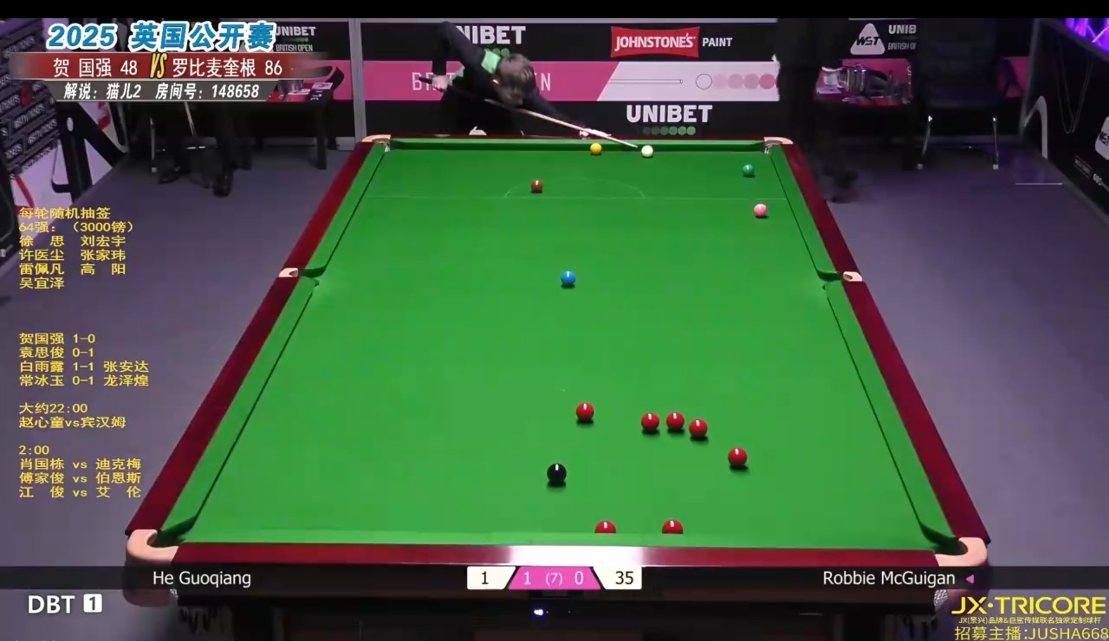 Looking at the second frame, He Guoqiang committed multiple mistakes, whereas McGuigan’s long potting was very precise, making the significant point lead reasonable. However, considering the skill gap, He Guoqiang is ranked about 40 places higher than McGuigan and has stronger overall ability. Personally, I believe He Guoqiang will ultimately win 4-1 or 4-2 to advance to the last 32.