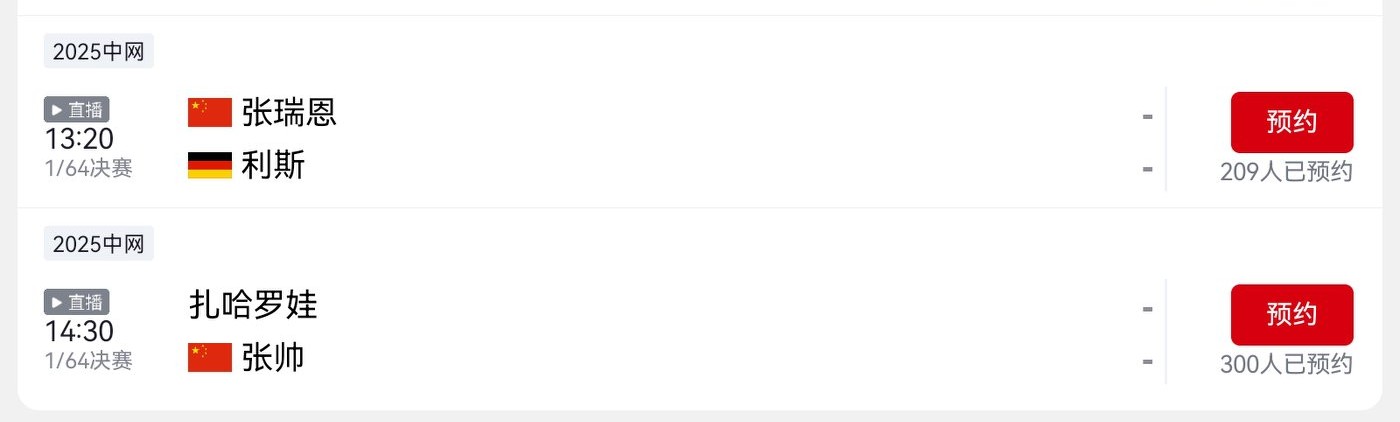 Friendly reminder: At 1:20 PM today, Zhang Shuai will play, followed by Zhang Rui'en at 2:30 PM. Both matches will be broadcast live on CCTV-5 or Yangshipin.
