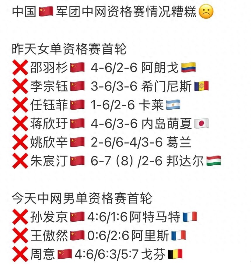 However, after the ten singles qualifying matches concluded, none advanced to the second round; all were eliminated in the first round, leading fans and netizens to sadly ask, “Are you surprised or not?”