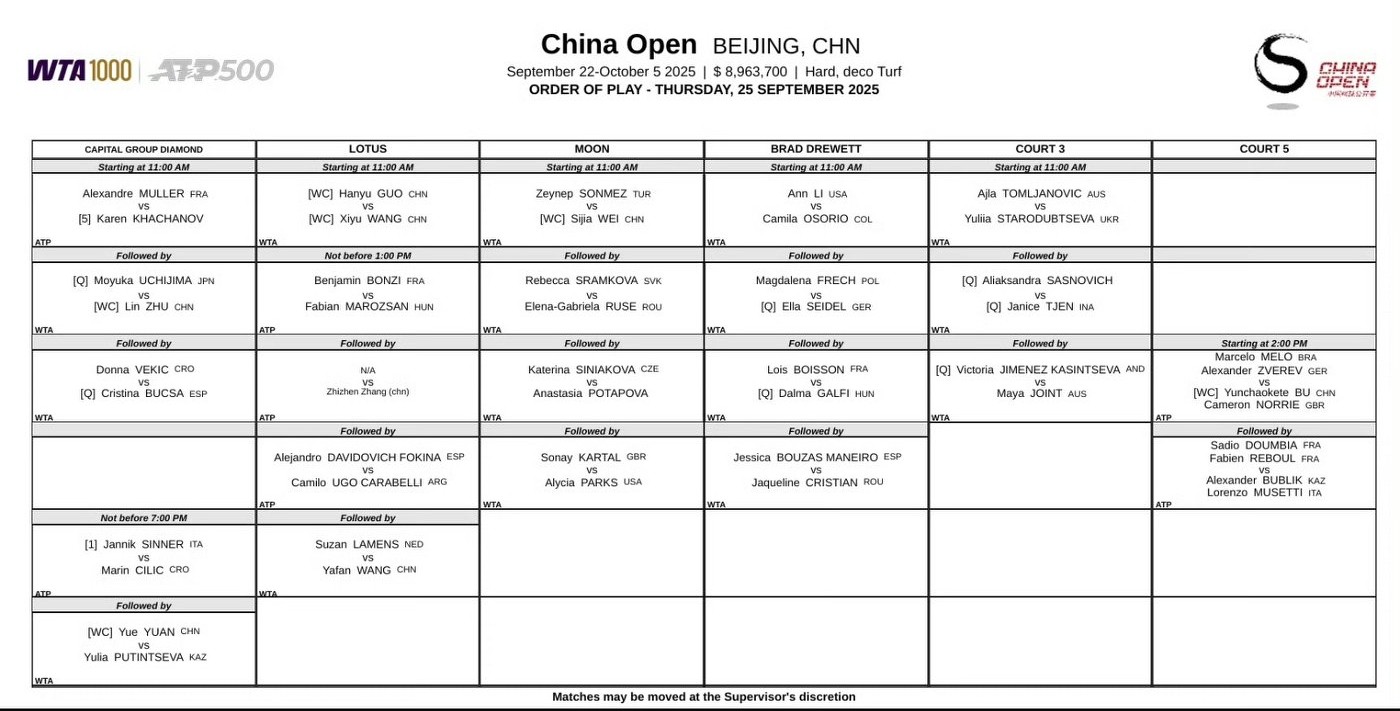 The China Open continues its first round today (September 25, 2025), featuring five matches with national players Wang Yafan, Zhang Zhizhen, and others, broadcast live on CCTV-5.