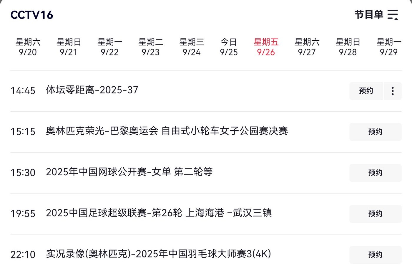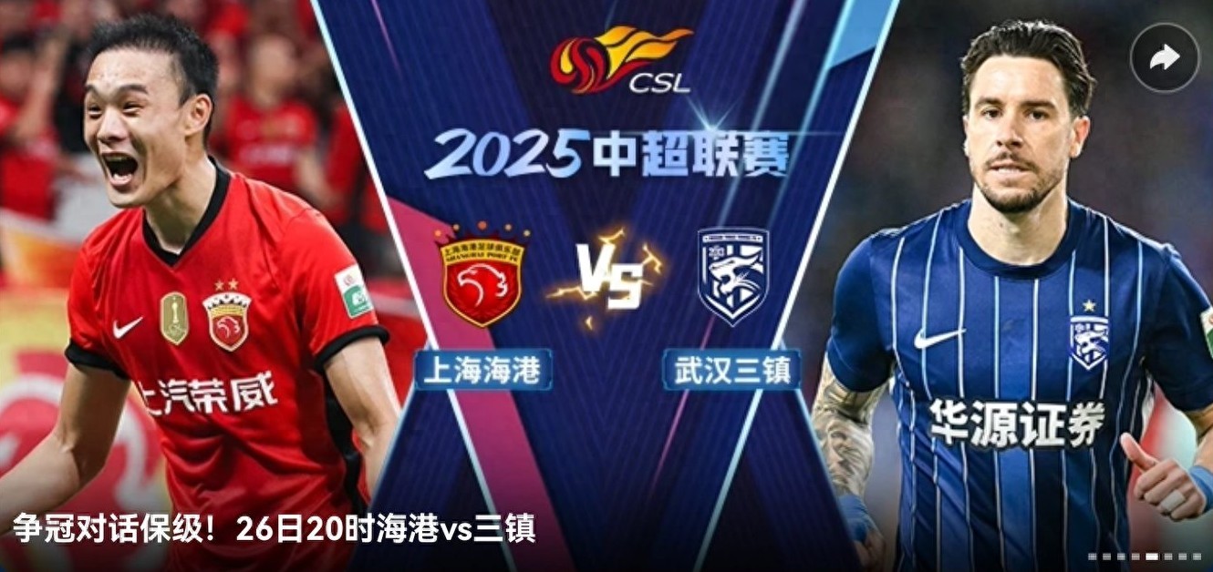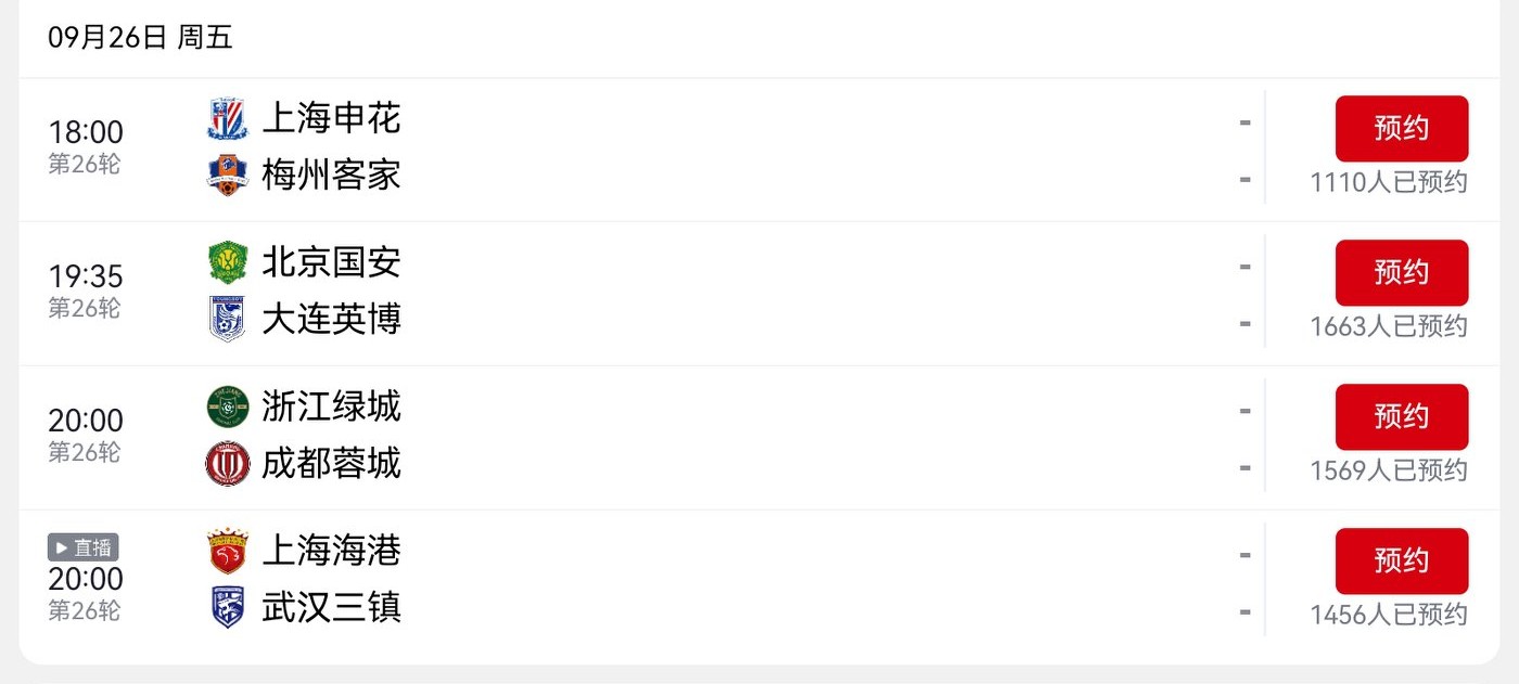 On September 26, 2025, the Chinese Super League will conduct four games in its 26th round, all broadcast live on CCTV-16 and Migu Video.