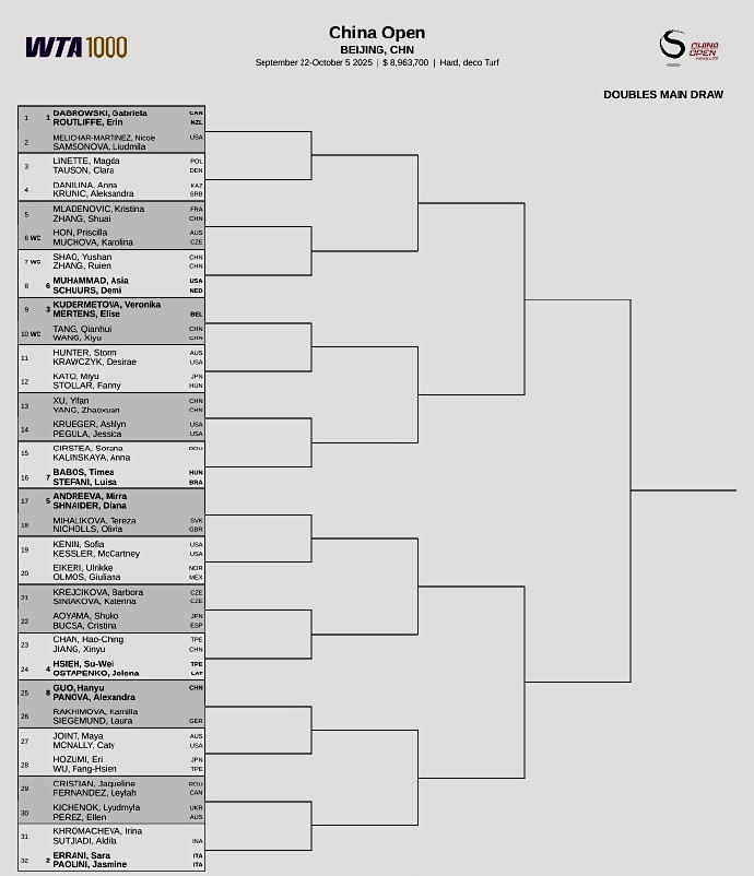 Additionally, the China Open women's doubles draw has just been released, with 11 Chinese female players forming six pairs. First round matchups are: Zhang Shuai/Muradnovic vs. Han Tianyu/Muhova, Shao Yushan/Zhang Rui'en vs. Muhammad/Shuls, Kudermetova/Mertens vs. Tang Qianhui/Wang Xiyu, Xu Yifan/Yang Zhaoxuan vs. Krug/Pegula, Jiang Xinyu/Zhan Haoqing vs. Hsieh Su-wei/Ostapenko, Guo Hanyu/Panova vs. Rakhimova/Sigmund.