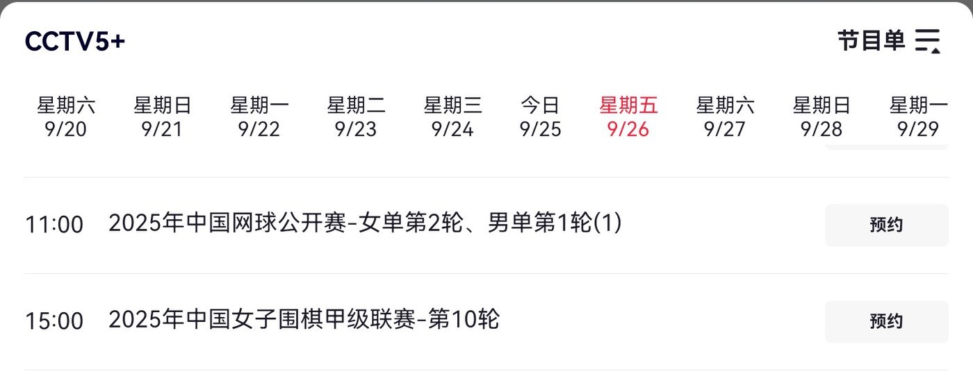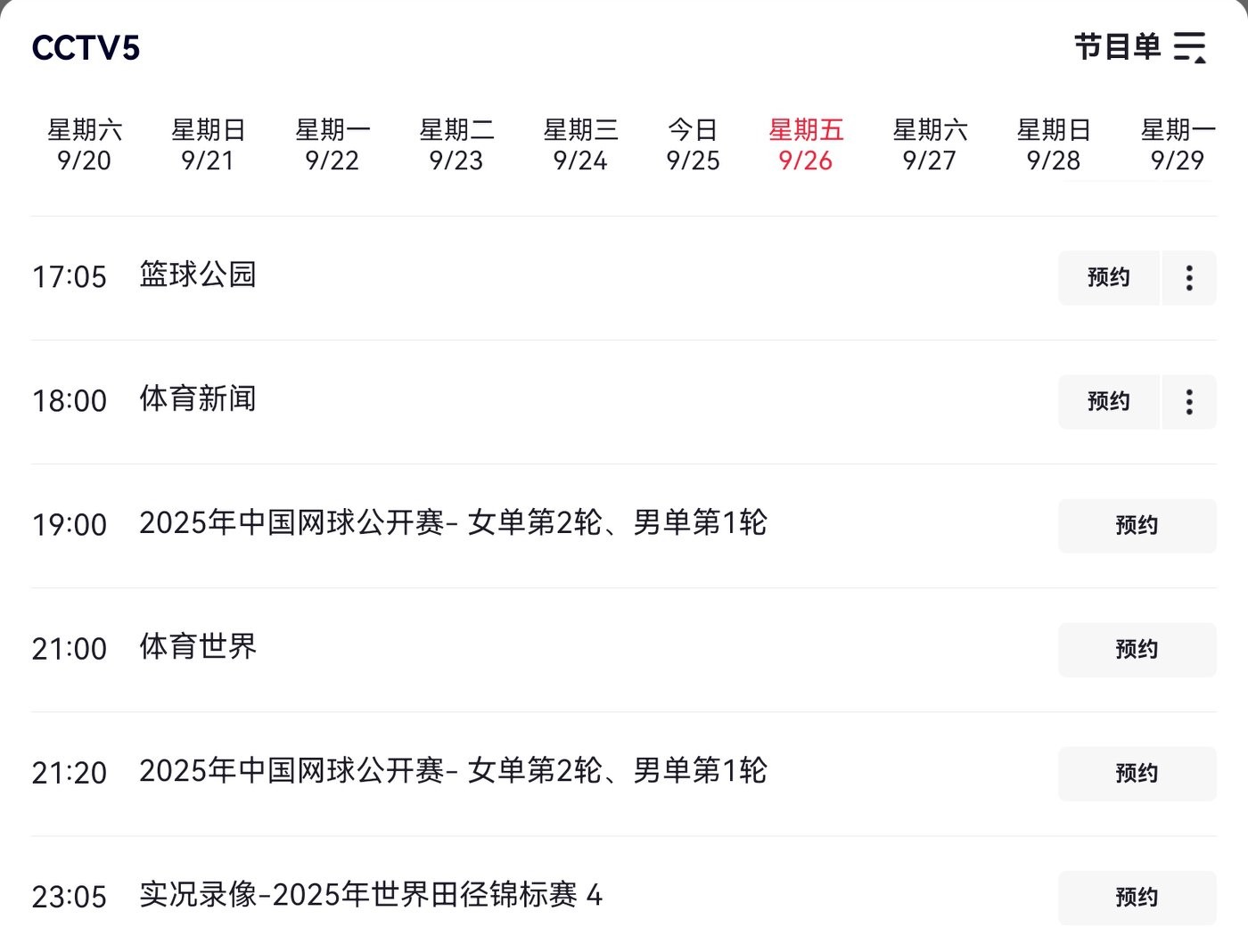 CCTV-5 Channel 5's live broadcast schedule for the China Open on September 26, 2025, has been published on the official website, including players such as Wang Xinyu, Zhang Shuai, Shang Juncheng, and Bu Yunchaokete.