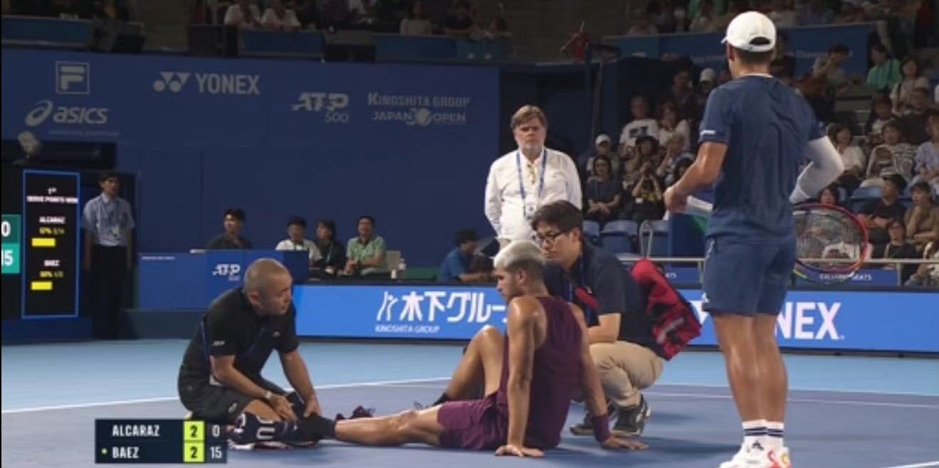 In the fifth game of the first set against Argentina’s Baez, after moving extensively to retrieve a shot, Alcaraz suddenly collapsed holding his left foot. The camera showed a pained expression on Alcaraz’s face, indicating a significant injury. The tournament doctor then came onto the court to bandage his ankle, and the match was temporarily paused for medical treatment.