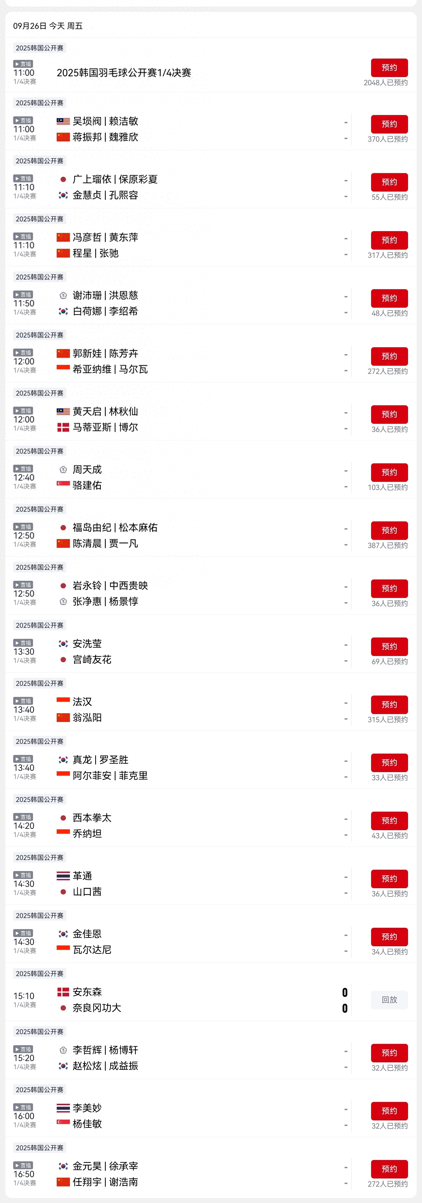 CCTV Sports will broadcast the entire Korea Open Badminton live today (2026.9.26), with six matches featuring the Chinese team aiming for four wins.