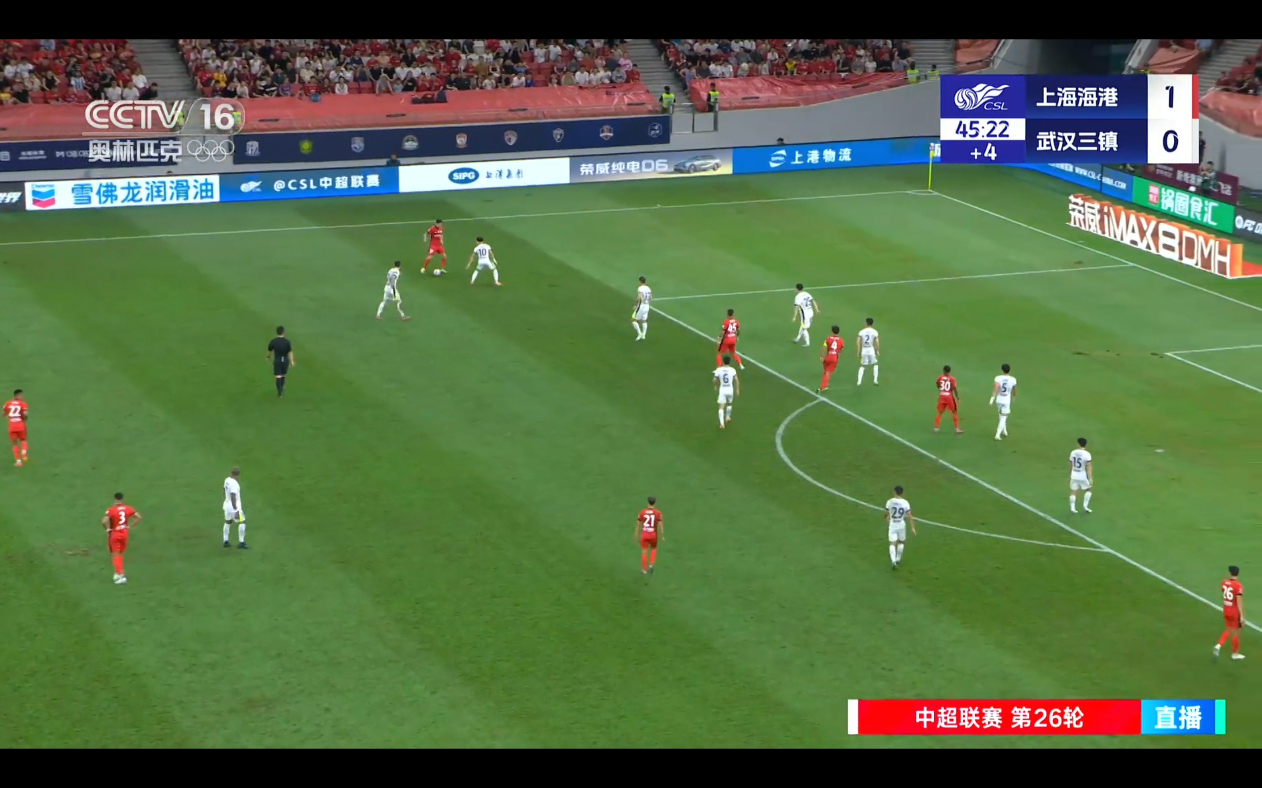 The match has reached the final moments of the first half, with Shanghai Port leading Wuhan Three Towns 1-0.