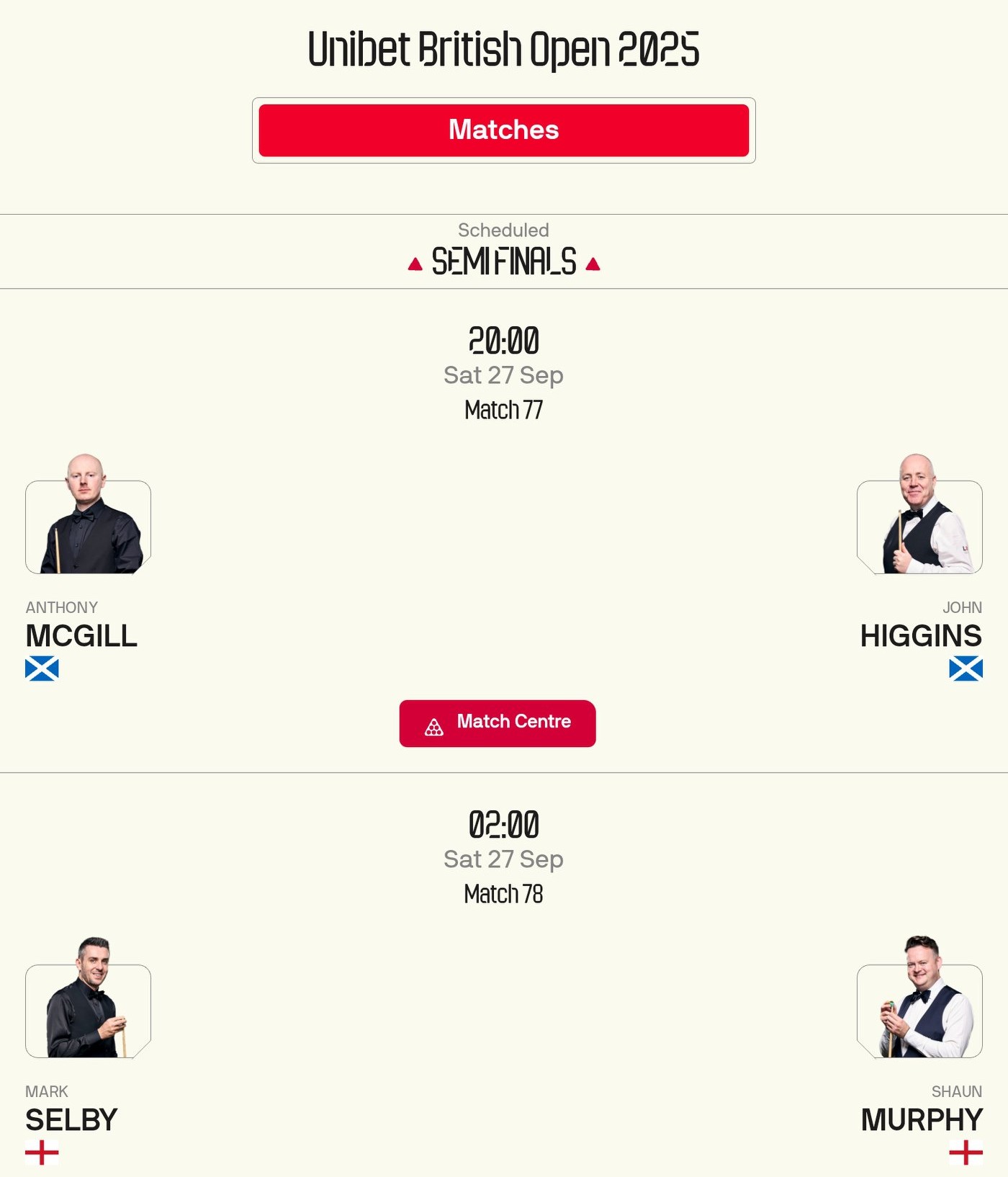 The Snooker UK Open semifinals are happening today (September 27, 2025), with Higgins vs. McGill and Selby vs. Murphy, streamed on Migu Video and Huya Live.