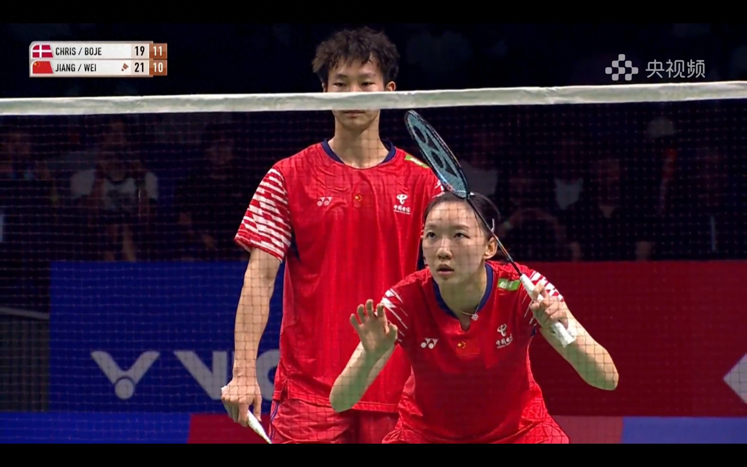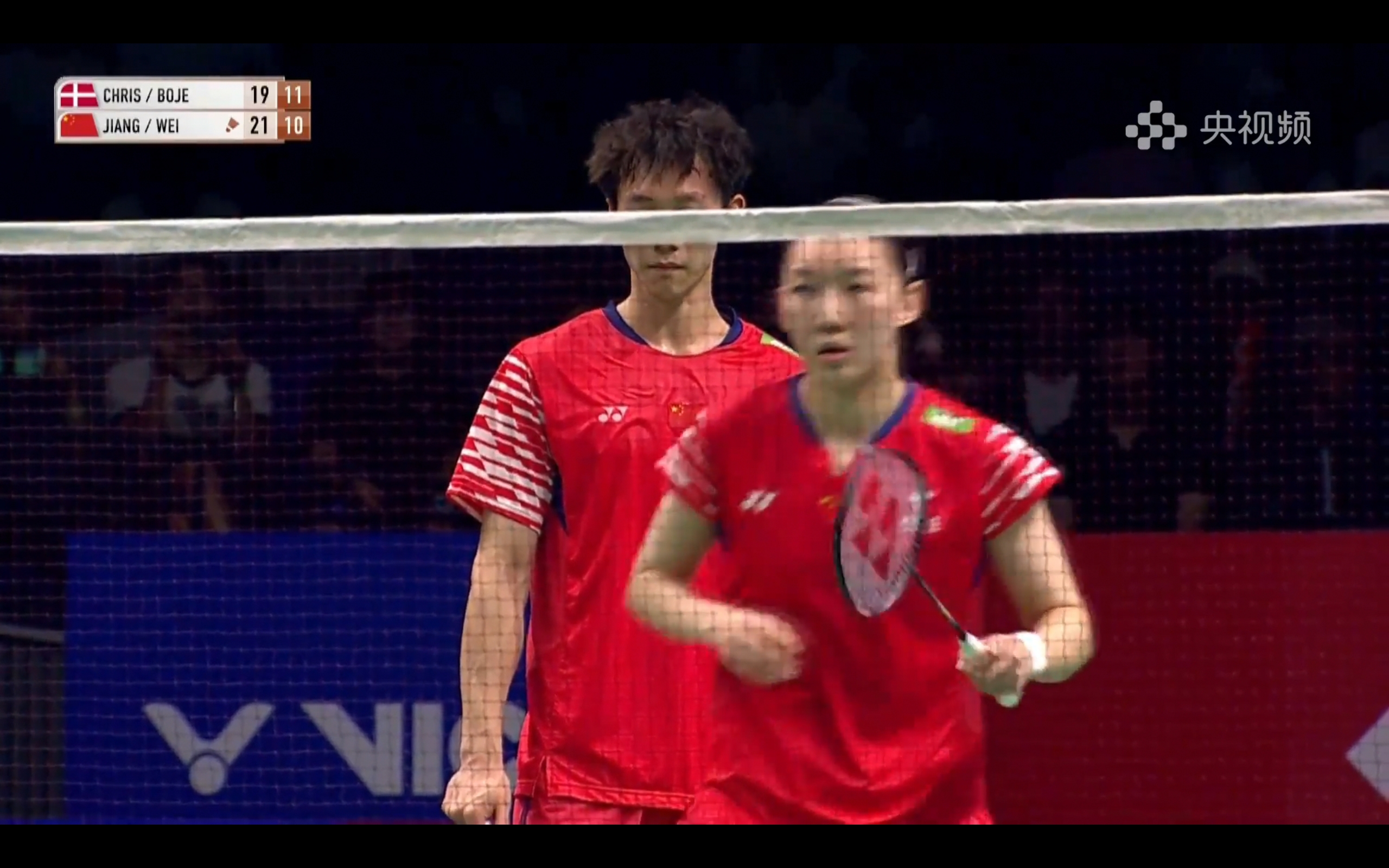 This match follows a best-of-three format; Jiang Zhenbang/Wei Yaxin took the first game 21-19 against Matthias/Boehringer. In the second game, Jiang Zhenbang/Wei Yaxin are narrowly leading 11-10.