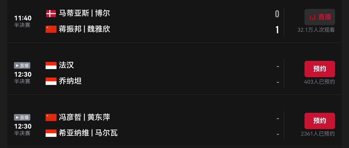 Attached is today’s schedule. The Fenghuang pair is about to play soon. We hope they can also defeat their opponents and meet the Jiang-Wei duo in the final, securing the top two spots in advance.