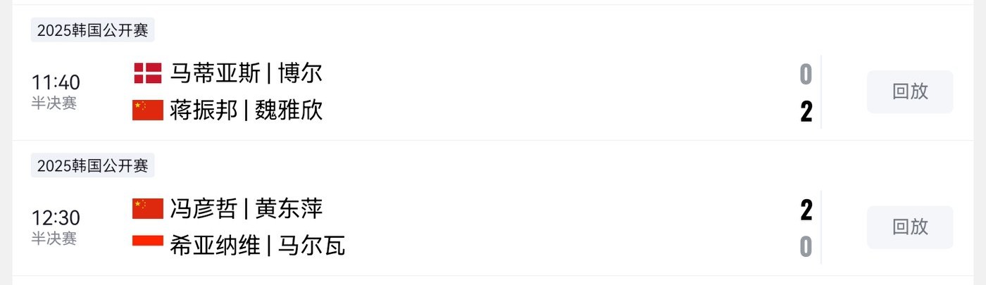 In today's (2025.9.27) Badminton Korea Open update, the Chinese team finished all their games. The mixed doubles teams Feng Yanzhe/Huang Dongping and Wei Yaxin/Jiang Zhenbang both won their matches and will meet in the final, guaranteeing gold and silver medals beforehand.