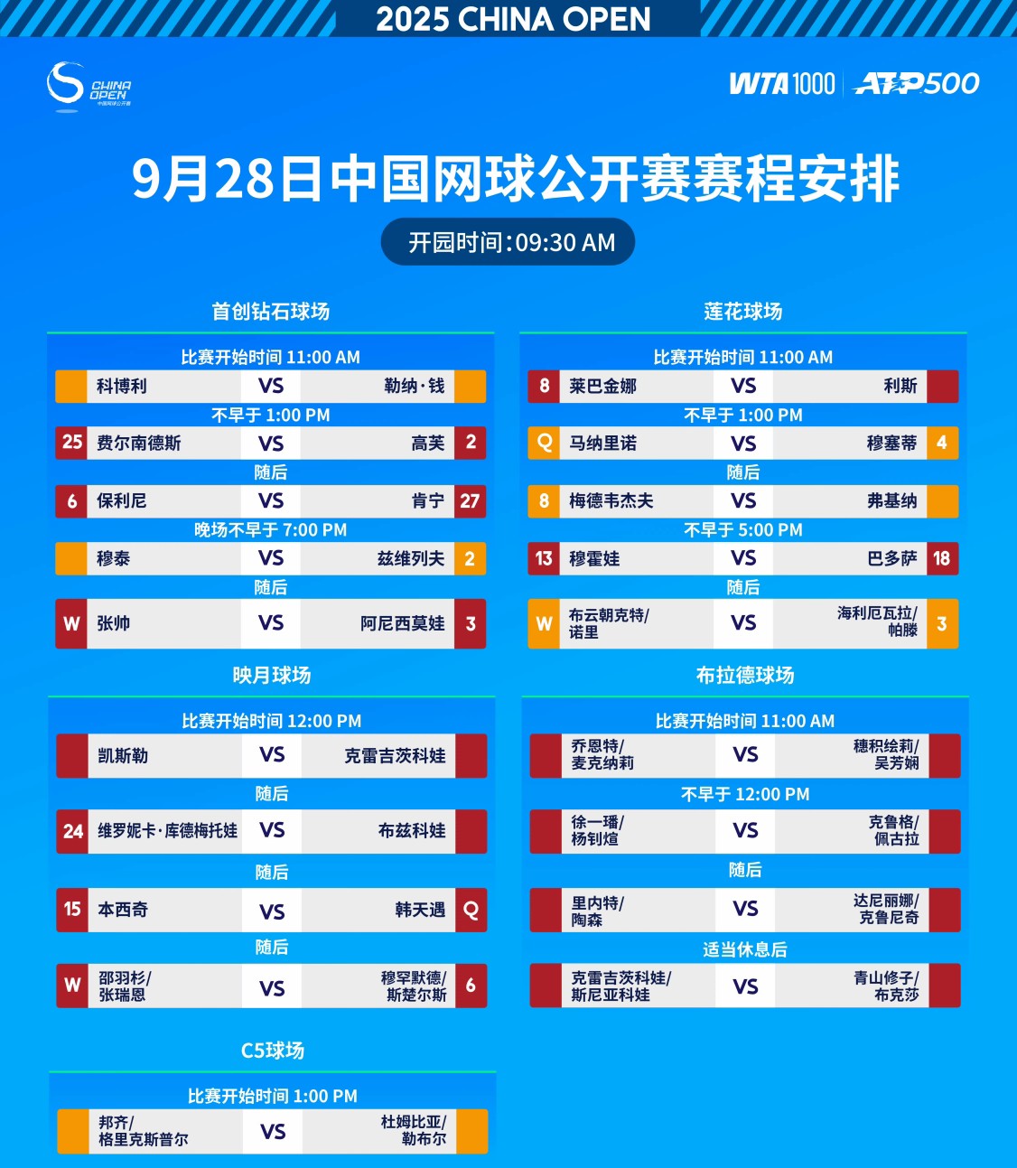 The third round of the China Open tomorrow (September 28, 2025) features Zhang Shuai vs. Anisimova, live on CCTV-5.