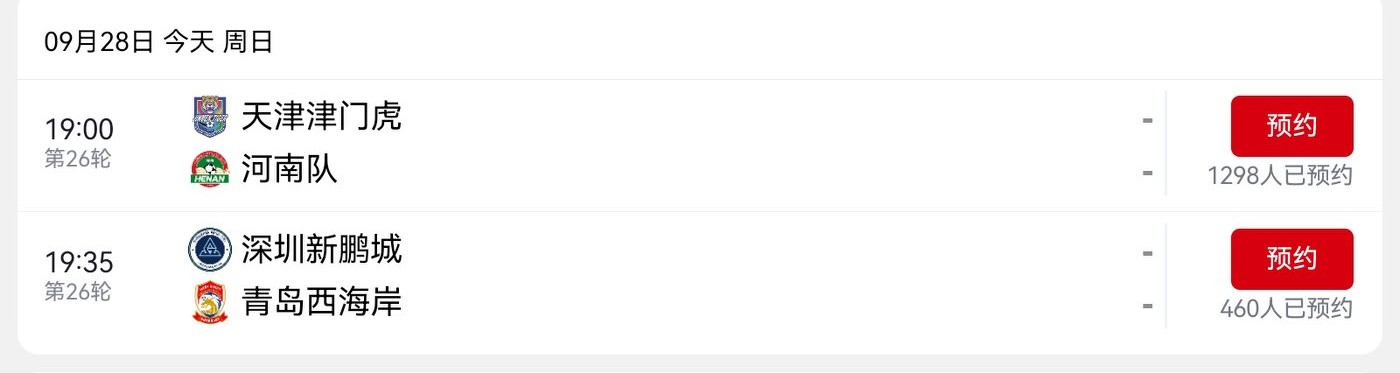 On September 28, 2025, the Chinese Super League holds two 26th round matches: Tianjin Jinmen Tiger vs Henan and Shenzhen Xinpengcheng vs Qingdao West Coast, streamed live on Gumi Video.