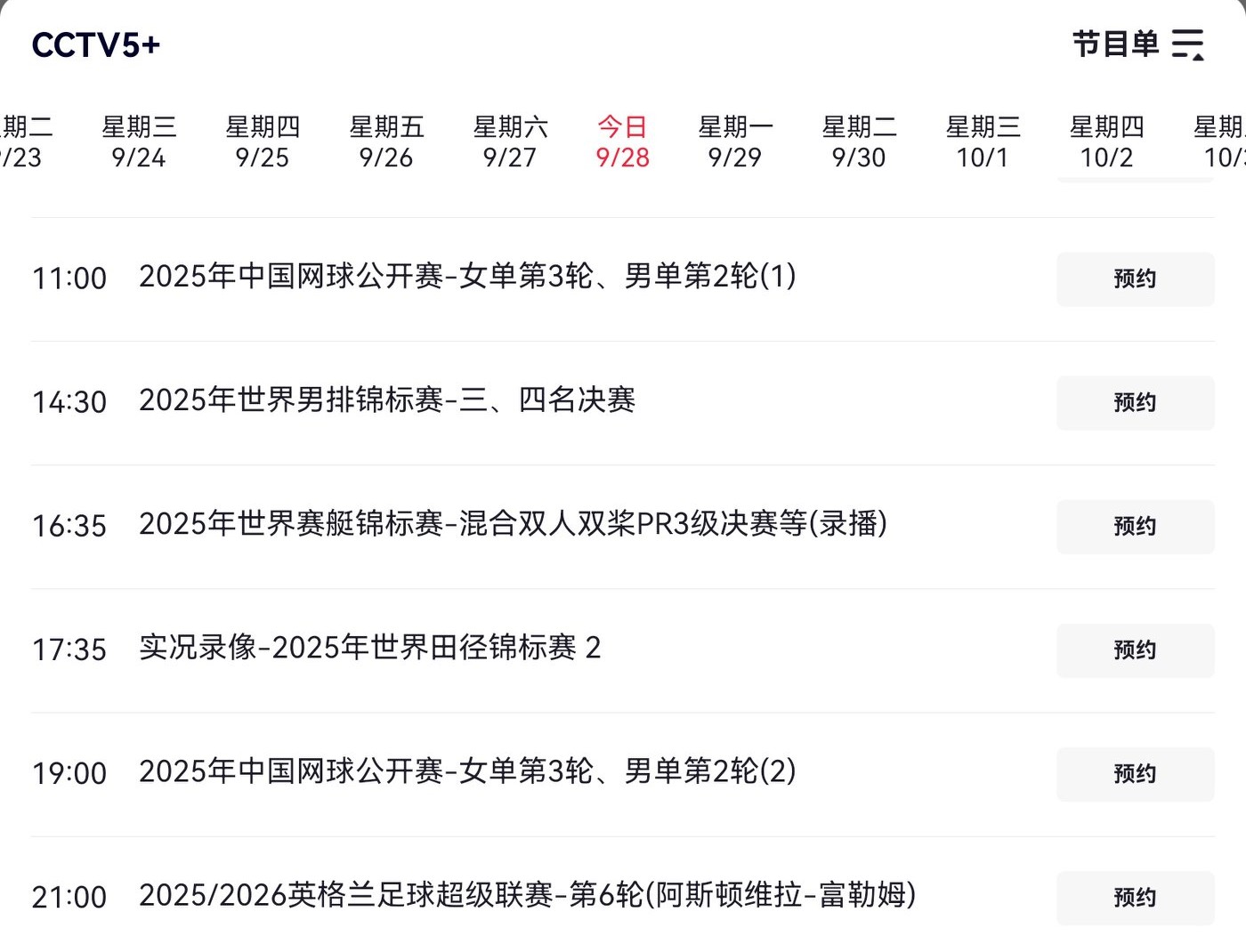 The live broadcast schedule for the China Open on CCTV-5 today (2025.9.28) has been announced, with Zhang Shuai and Xiaobu among the participants.