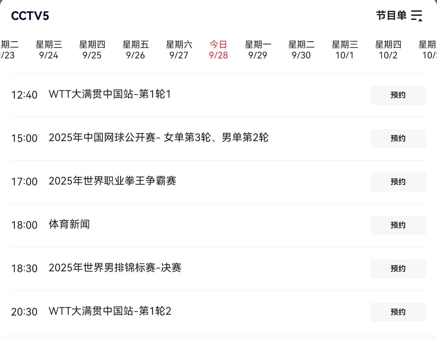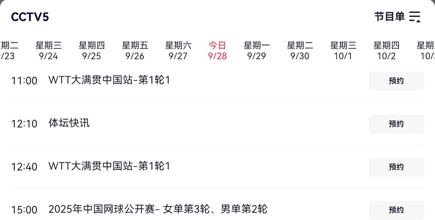 CCTV-5 revealed today’s (September 28, 2025) live broadcast schedule for the WTT China Grand Slam table tennis tournament, with Sun Yingsha, Wang Chuqin, and others taking part. See the image above for details.