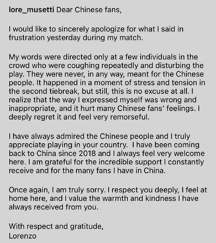 Musetti said, "Dear Chinese fans, I sincerely apologize for the words I said yesterday out of frustration during the match. My remarks were only directed at a few people in the crowd who were constantly coughing and disturbing the game. These words were absolutely not aimed at Chinese fans. This happened during the tense moment of the second tiebreak, but that is no excuse. I realize my way of expressing myself was wrong and inappropriate, and hurt many Chinese fans’ feelings. I deeply regret this and feel very remorseful. I have always admired the Chinese people and truly appreciate playing in your country. Since 2018, whenever I come to China, I always feel very welcomed. I thank you for the strong support you have given me and all the fans in China. I apologize again, I respect you deeply, I feel at home here, and I cherish the warmth and kindness you have always shown me."