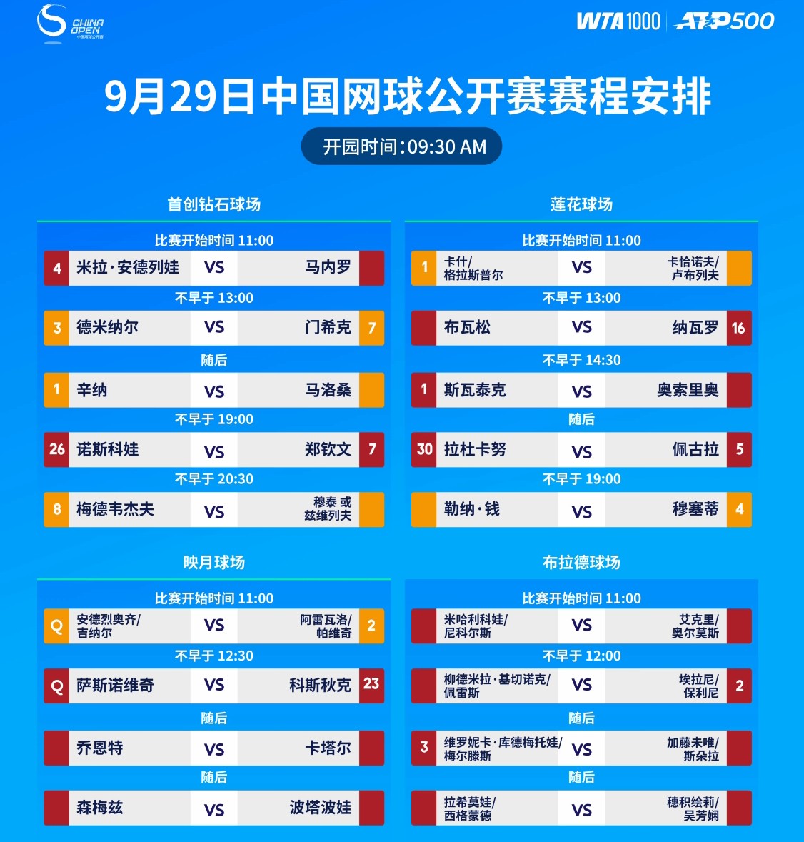 The China Open's third round continues tomorrow (September 29, 2025) featuring Zheng Qinwen vs. Noskova, live on CCTV-5+, Yangshipin, and Migu Video.