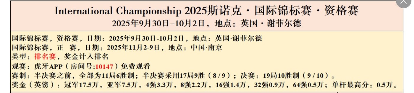 The Snooker National Championship starts tomorrow (2025.9.30), featuring many national players, with live coverage on Migu Video and Huya. Matches of Zhao Xintong, Xiao Guodong, Ding Junhui, and Zhou Yuelong have been postponed.